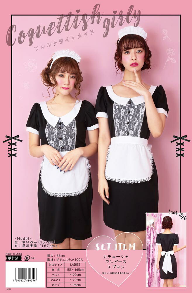 ■セット内容:カチューシャ、ワンピース、エプロン ■素材:ポリエステル100% ■洗濯表示:ワンピース/洗濯不可、塩素系漂白剤による漂白不可、アイロンは中温で当て布使用、ドライクリーニング不可 エプロン/洗濯機不可、弱い手洗い可、塩素系漂白剤による漂白不可、アイロンは中温で当て布使用、ドライクリーニング不可 ■商品サイズ:袋入りパッケージ有(約W260×H390×D50mm) ■総重量:395g ■対応サイズ:Ladies/身長 155〜165cm、B 〜90cm、W 〜70cm、H 〜96cm ■メイン部分の長さ(着丈等):88cm ■開き:ワンピース/背中心ファスナー、エプロン/後ろリボン ■モデル身長:ゆいみん157cm、早川実季167cm ■モデル着用サイズ:- ■B(実寸):92cm ■W(実寸):72cm ■H(実寸):98cm ■肩幅(実寸):37cm ■袖丈(実寸):21cm ■股下(実寸):- ■モデル名:ゆいみん、早川実季 ■原産国:中国 ■その他パーツ情報:- ■裏地の有無:無し ■商品について注意事項: ※生産時期やロット、デザインによって、多少サイズ・色・柄が異なる場合があります。