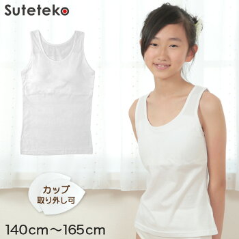 ジュニア カップ付き タンクトップ 下着 女子 140cm〜165cm (アンダー ゴム なし 小学生 女の子 胸 二重 インナー キッズ 女児 ソフトカップ 綿100% シャツ カップ付きインナー 白 ブラトップ 肌着 140 150 160 165)